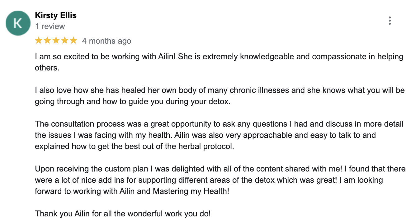 What caught my interest when I found Ailin on Instagram some years ago was exactly that: her deep knowledge and her passion for helping others. She seemed to know about illness and healing in all of its detail, also relating to her own story. Ailin is amazing at encouraging me and keeping me motivated - just as she comes across in her videos and posts on social media, she is such an incredibly sweet, calm, generous and caring person. She has shown me that healing is possible and I will be forever grateful to her for that!"